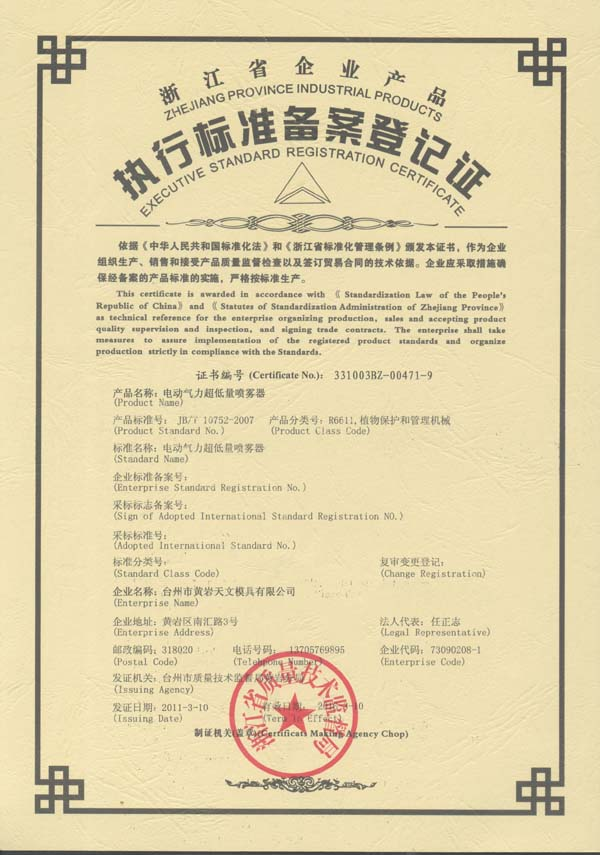 电动超低量喷雾器企业标准