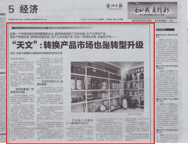 天文公司发明制造洗车器产品的成功转型,被台州日报树为低端制造业转型的榜样,原文如下: