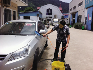 “一般洗车,不但要赶到洗车店这么麻烦,而且一趟洗车下来,水资源耗费很厉害。”任正志的这款车载洗车器,不但让洗车能轻松在家里完成,而且与传统洗车相比,节约水量近90%。